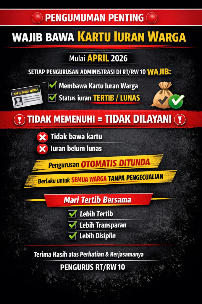 Dalam rangka meningkatkan ketertiban administrasi serta kedisiplinan warga, mulai April 2026 diberlakukan WAJIB penggunaan Kartu Iuran Warga sebagai salah satu persyaratan utama dalam setiap pengurusan administrasi di tingkat RT maupun RW.